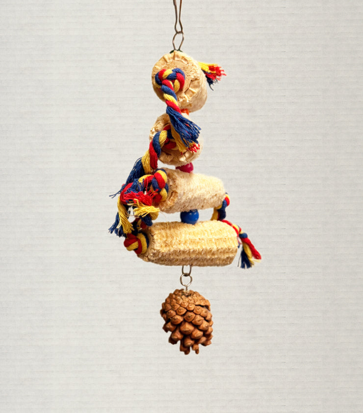 Corn-less cobs on a metal stick, with removeable cotton rope that goes through each cob, also has a little pinecone hanging off the bottom.Β