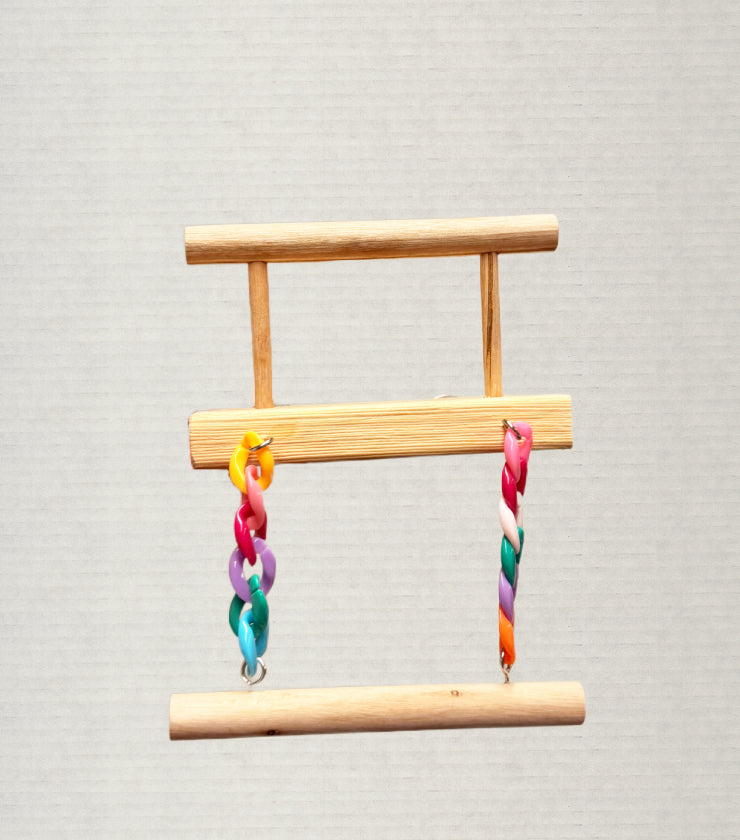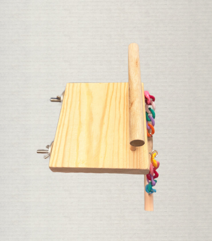 A stage perch with a swing dangling from it. It has 2 bolts on the back that allow for attachment to a cage.