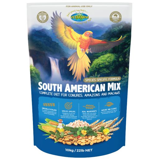 South American birds, such as conures, quakers, macaws and amazons, have their own specific nutritional needs. South American Mix has been formulated to provide high quality nutrition that specifically suits the dietary requirements of South American birds. With fresh Australian grown almonds, balanced amino acids, vitamins and minerals for optimum growth, breeding, brain function and optimum feather development.