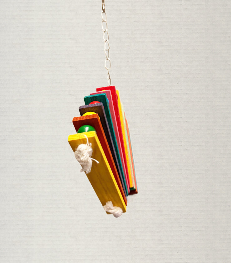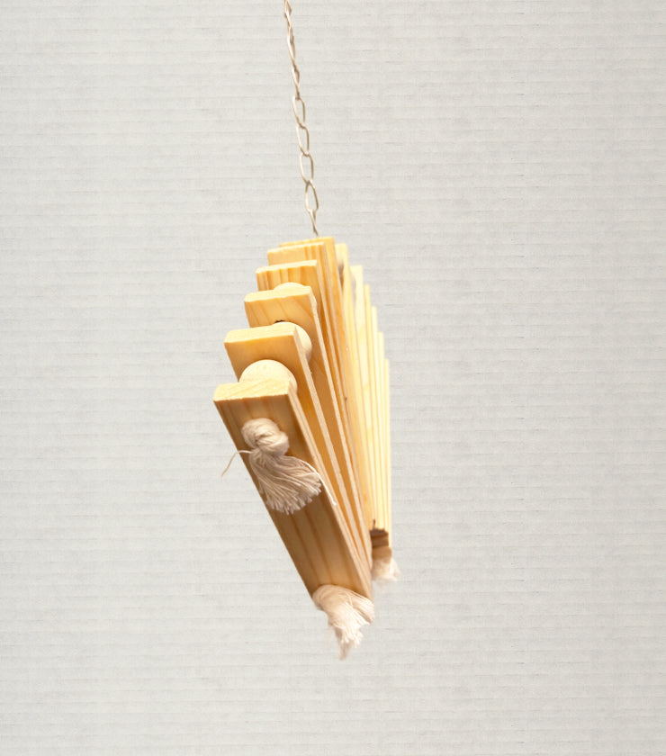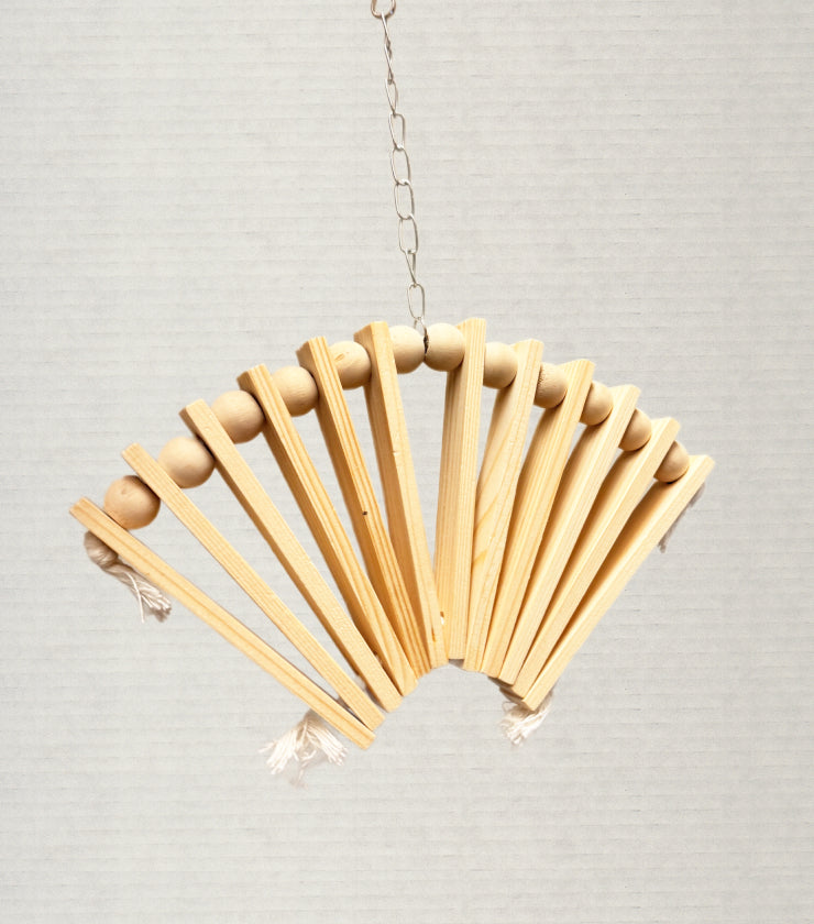 12 small wooden plank arranged in an arch pattern on two cotton ropes with wooden beads separating each plank, hung on a chain.